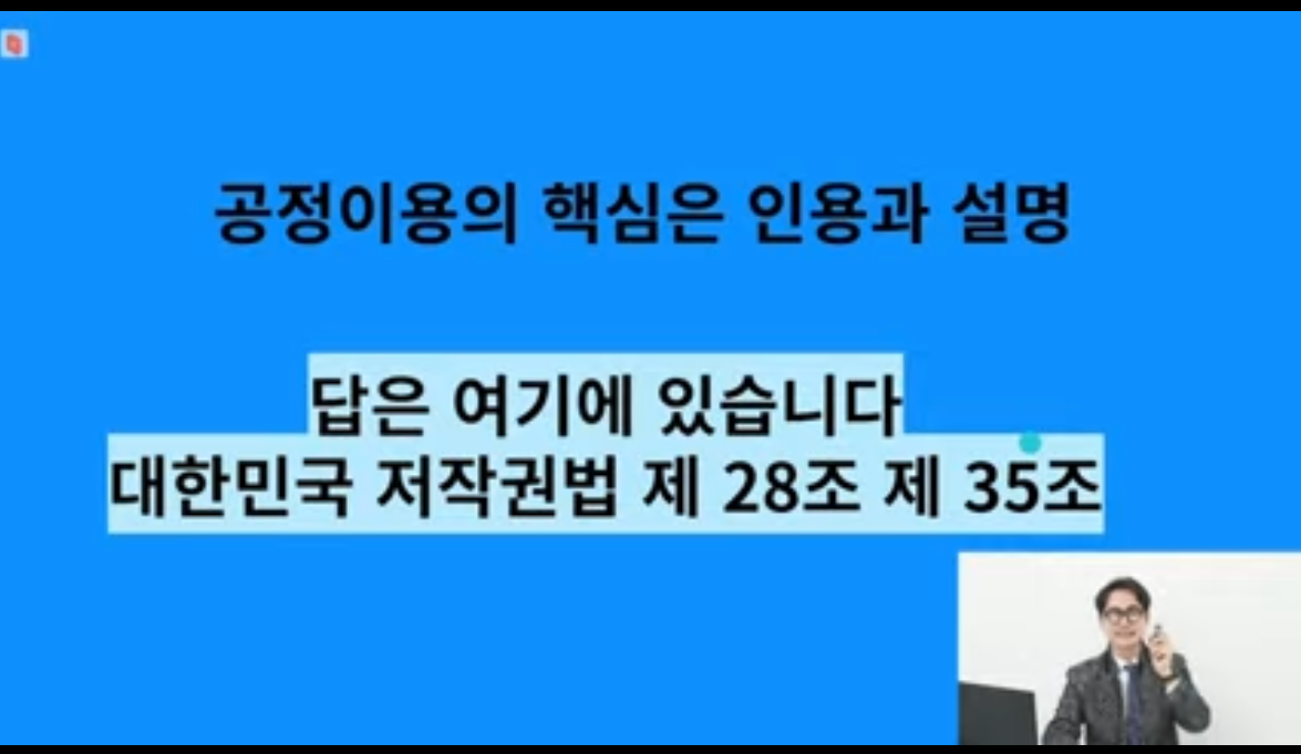 특히 인상 깊었던 부분은 저작권법과 공정이용에 대한 구체적인 설명이었습니다. '인용과 설명이 핵심'이라는 말과 함께, 대한민국 저작권법 제28조, 제35조까지 짚어주시면서 콘텐츠 제작자들이 꼭 알아야 할 법적 기준을 명확히 알려주신 점은 굉장히 유익했어요.