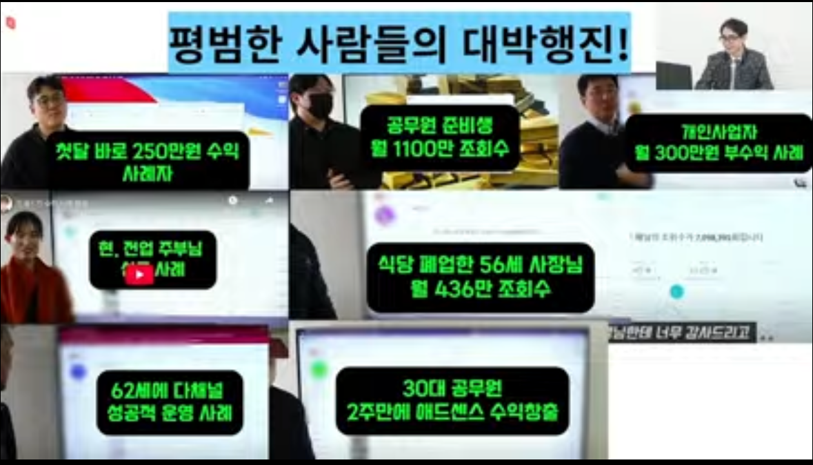 또한 강의 중간에 등장한 여러 수강생들의 성공 사례(첫 달 250만 원 수익, 월 조회수 1100만 회 달성, 62세 다채널 운영 등)는 엄청난 동기부여가 되었어요. 나도 할 수 있겠다는 생각이 절로 들었고, 실제 유튜브 채널을 어떻게 기획하고 운영해야 하는지에 대한 실전 팁도 아낌없이 전해주셔서 큰 도움이 되었습니다.